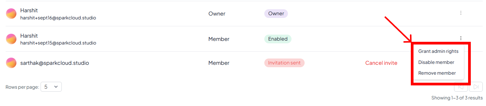 Ownerrole is fixed and cannot be reassigned.Enabledindicates an active member.Disabledmeans access is revoked until re-enabled.Administratorhas extended management rights. user.Invitation Sentshows pending acceptance from the invited