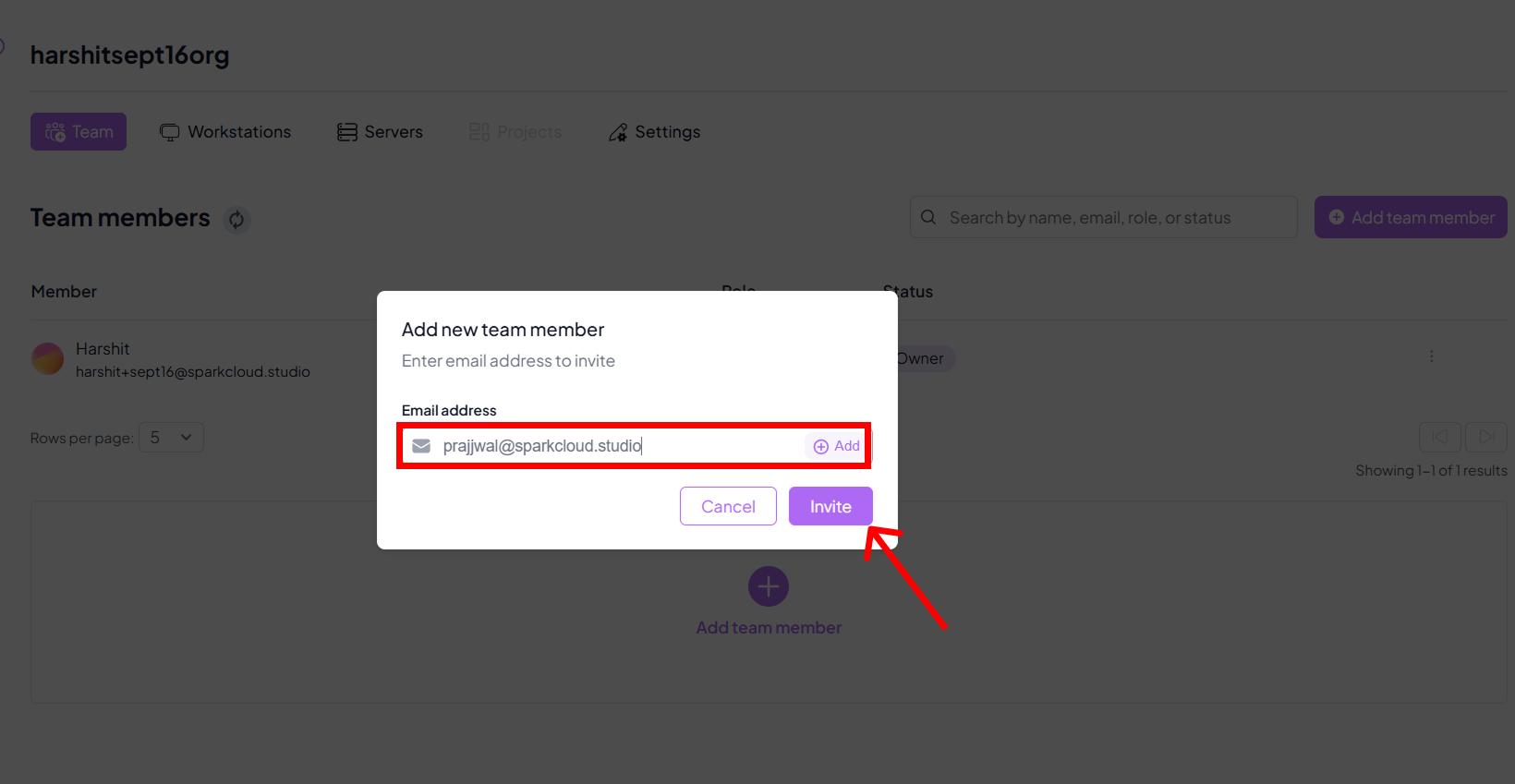 Type the email addresses of the teammates you want to invite. You can add multiple addresses at once, by clicking on the + icon.