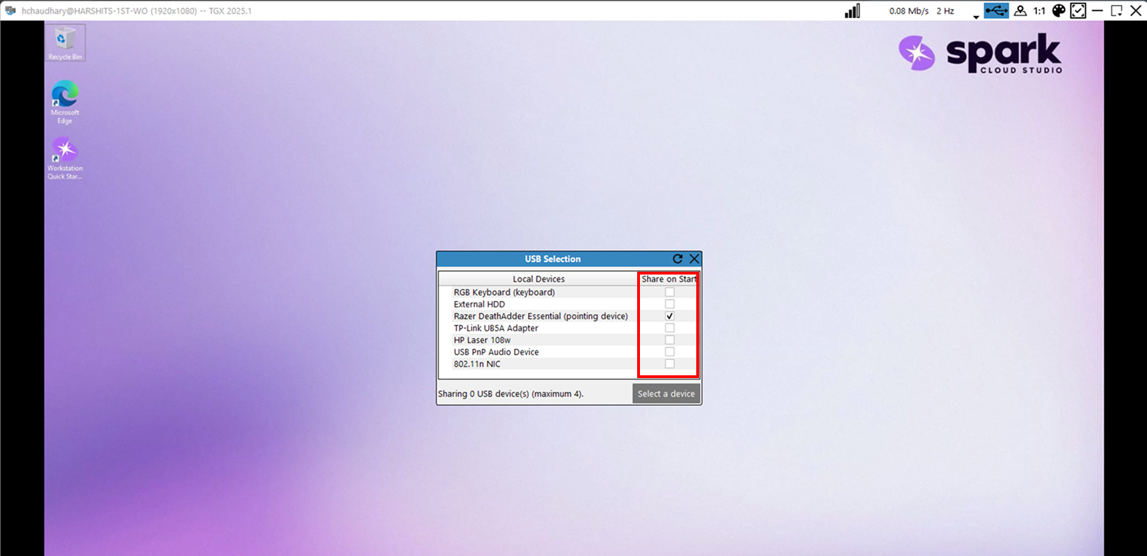 In the list of detected Local Devices, check the boxes next to the USB devices you wish to share with your workstation session. You can enable "Share on Start" to automatically connect them next time.