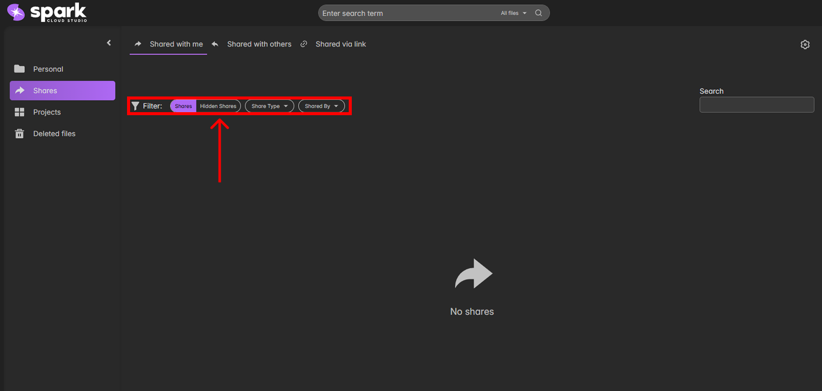 You can use the filters above the file list to narrow results based on Share Type, Shared By, or Visibility (Hidden/Shown).